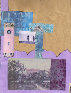 U.N.C.L.E.!!! As of this afternoon, after work, I'm officially done with the Big A** journal. I ripped out the last 30 pages - will recycle them into my next handmade visual journal, as the paper holds up to abuse well enough for that! Exploding spine, impatience with the bulky, unwieldy size. For the first time in 33 years, I gave myself permission to STOP a journal before all the pages were filled. Man, I shoulda coulda woulda done it a lot sooner if I'd known what a doggone relief it would be. Eesh, blimey and shite! Next, I'm finishing my Big A** Purse journal, which was expelled from my purse because I, Toni, have downsized my purse to one which measures (are you ready for this?): 8 inches across, 5" tall, and about 2" thick. It houses my wallet, my keys, my clip-on sunglasses, 200 pens, and my cell phone. Also a relief, it has to be said. Hence, below, the last two layouts in the current written journal.